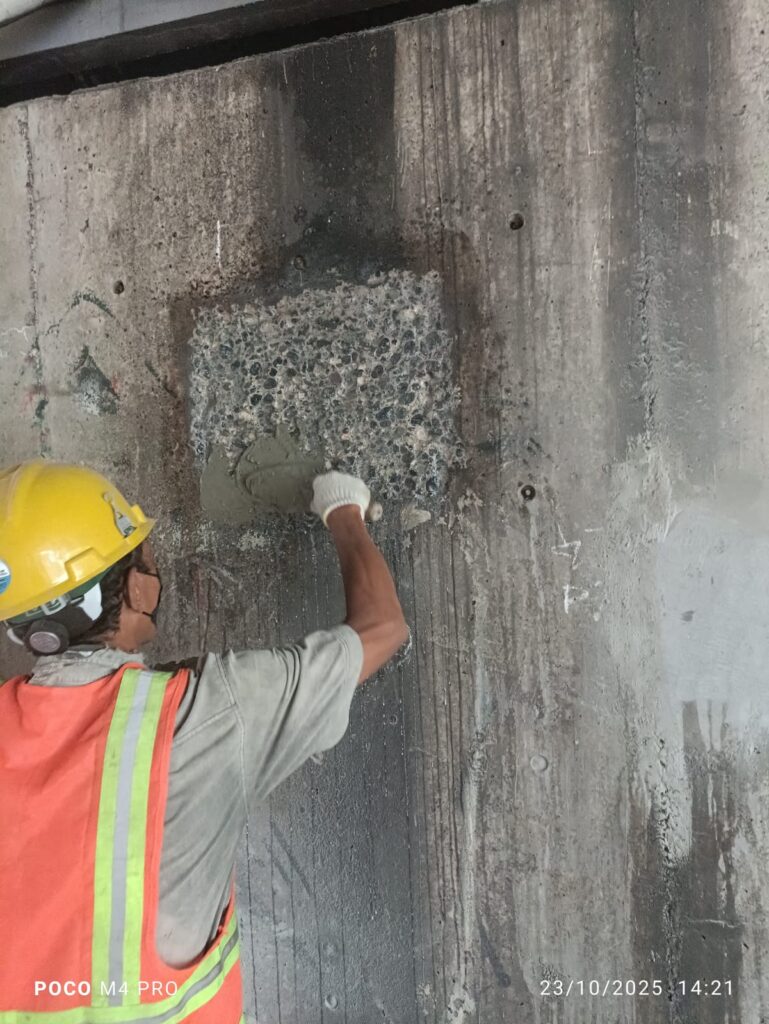 Setelah proses chipping, dilakukan patching menggunakan mortar khusus non-shrink atau repair mortar berkualitas tinggi. Metode patching berfungsi untuk: